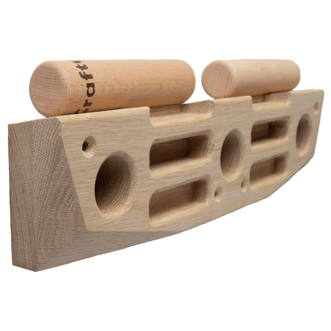 Das kompakte Trainingsboard ist sauber verarbeitet und besteht aus hochwertigem, hautfreundlichem Eichenholz. Mit seinen kompakten Maßen eignet es sich ideal für knapp bemessen Raum und kann beispielsweise über dem Türrahmen montiert werden. Im Lieferumfang sind ebenfalls zwei Rundhölzer (Pegs) enthalten. Diese passen genau in die Löcher des Trainingboards. So kann man am Brett praktischerweise das Hangeln und Hochziehen üben. Das stählt den Schulter- und Armbereich. Die unterschiedlichen Griffe bieten verschiedene Möglichkeiten die eigene Fingerkraft zu trainieren und zu steigern. Außerdem hat das Hangboard Befestigungsmöglichkeiten für Seile oder TRX-Bänder für ein umfassendes Training. An der Wand festgeschraubt, kann das Krafttraining losgehen!